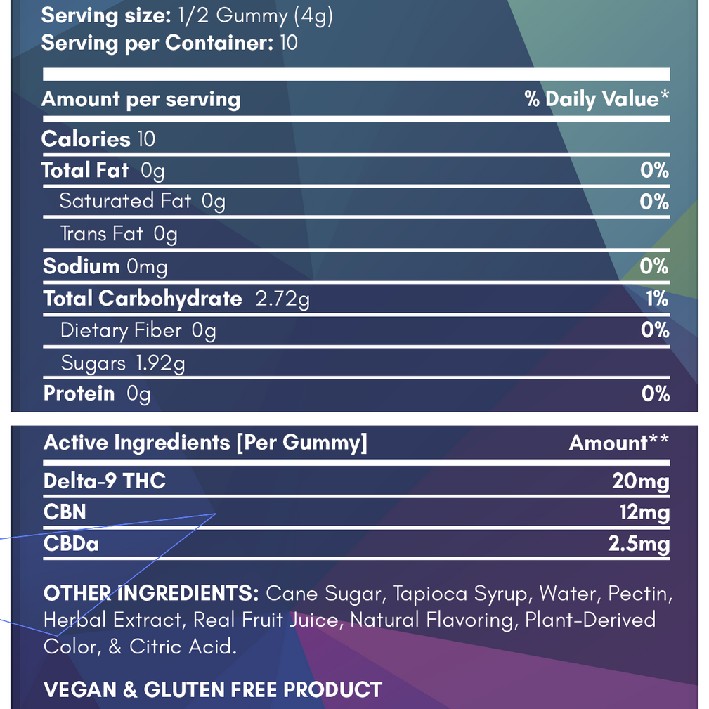 Many consumers describe the effects of Delta 9 THC as increasing presence, bringing down anxiety, and creating deeper and more meaningful social interactions and boosting mood. All of this can vary from person to person; as your state prior to consumption, the setting where these are consumed and your tolerance level will all create an experience nuanced to you. Whether you want to use Delta 9 THC to relax, feel more connected, enjoy nature, meditate, increase flow or party; this product is a great option and should benefit those experiences. Ingredients: Cane Sugar, Tapioca Syrup, Water, Pectin, Herbal Extract, Real Fruit Juice, Natural Flavoring, Plant-Derived Color, & Citric Acid. Suggested Serving: Start with a 1/2 gummy to gauge dose sensitivity. wait 1-2 hours before increasing dose, if necessary. Enjoy! It’s important to note that edibles take 30-60 minutes to first take effect (depending on a person’s digestive speed and other factors) and up to 1-2 hours to feel the peak of the effects. Never increase dosing until after 1-2 hours to ensure an accurate gauge of the peak intensity of the last dose and don’t cross-consume (consume with other products) the first time taking these so you know what the gummy’s effects are on their own. Store in a cool, dry place.
