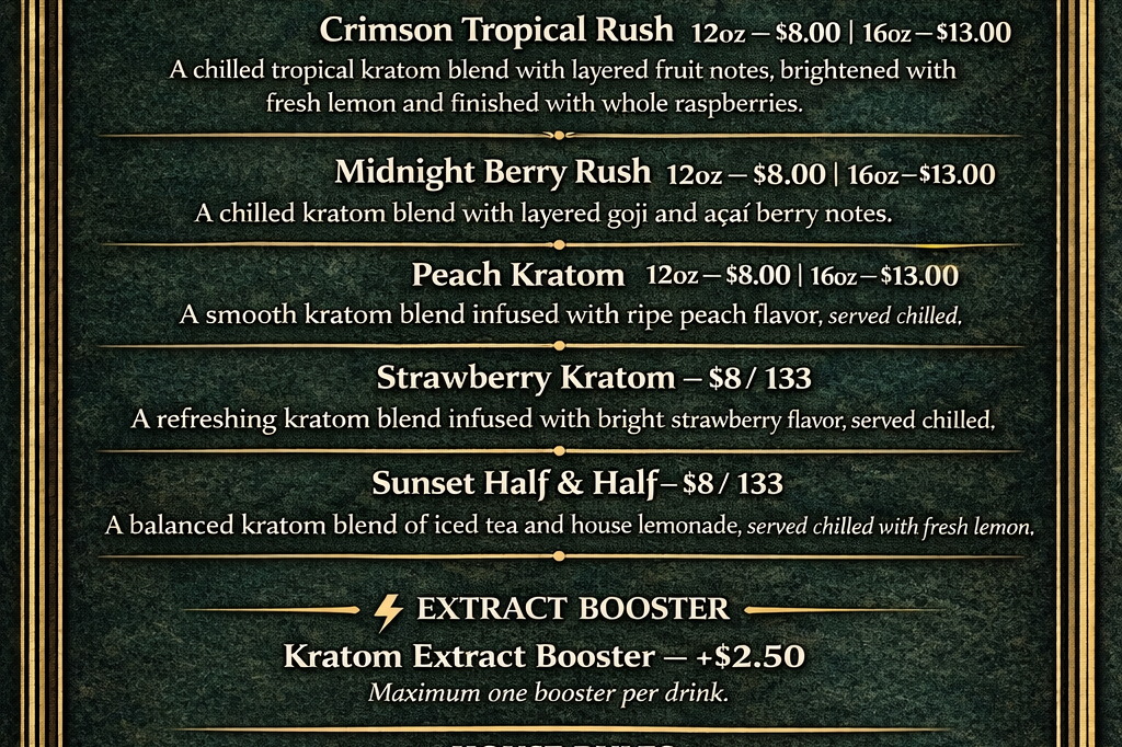We blend comfort, creativity, and intention. Our specialty hot dogs feature bold combinations crafted to satisfy every craving, paired perfectly with fruity kratom drinks and a curated selection of kava and infused beverages.